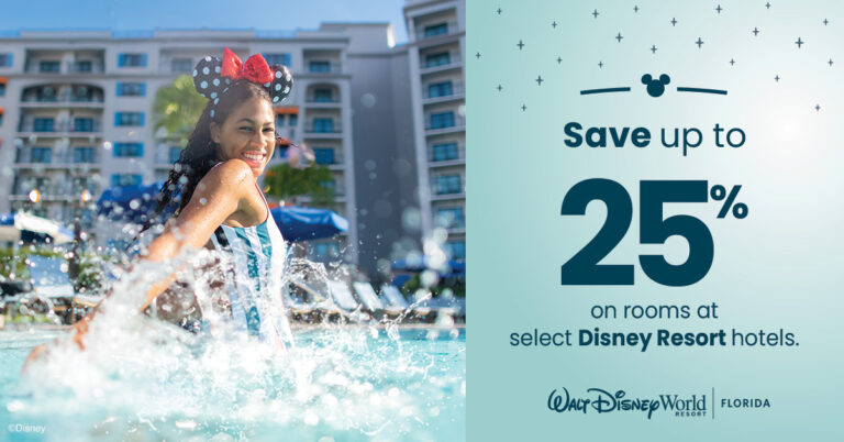 Save up to 25% on rooms at select Disney Resorts Collection hotels at Walt Disney World Resort for most nights from February 22, 2026, to April 30, 2026.